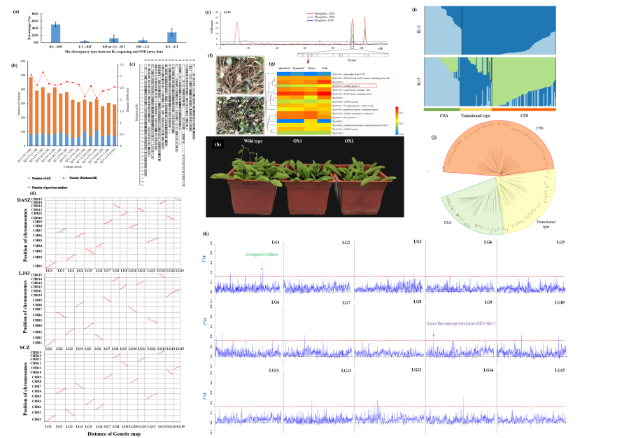 该芯片是首款茶树高密度SNP芯片,以“龙井43”(雌性)和“白毫早”(雄性)F1群体为材料,该芯片能够将18226个SNP位点绘入图谱,获得5325个bin-marker,连锁图谱总长度为2107.01厘摩,相邻标记平均遗传图距为0.39厘摩,构建了目前遗传密度最高的连锁图谱。