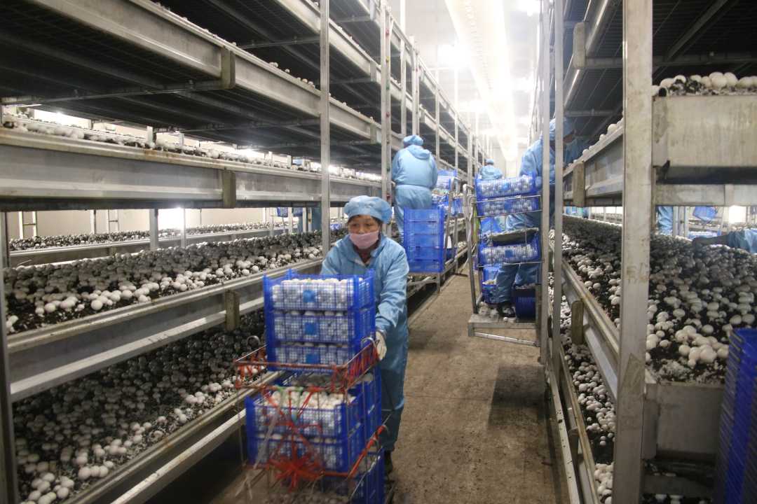 图为众兴菌业智能温控厂房内,工人们忙着采摘、转运双孢菇。孙亚科摄