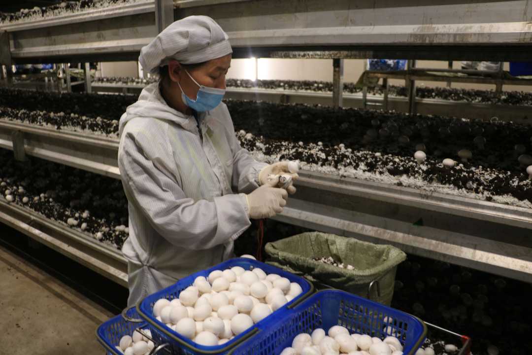 图为工人熟练地采摘已经成熟的双孢菇。孙亚科摄
