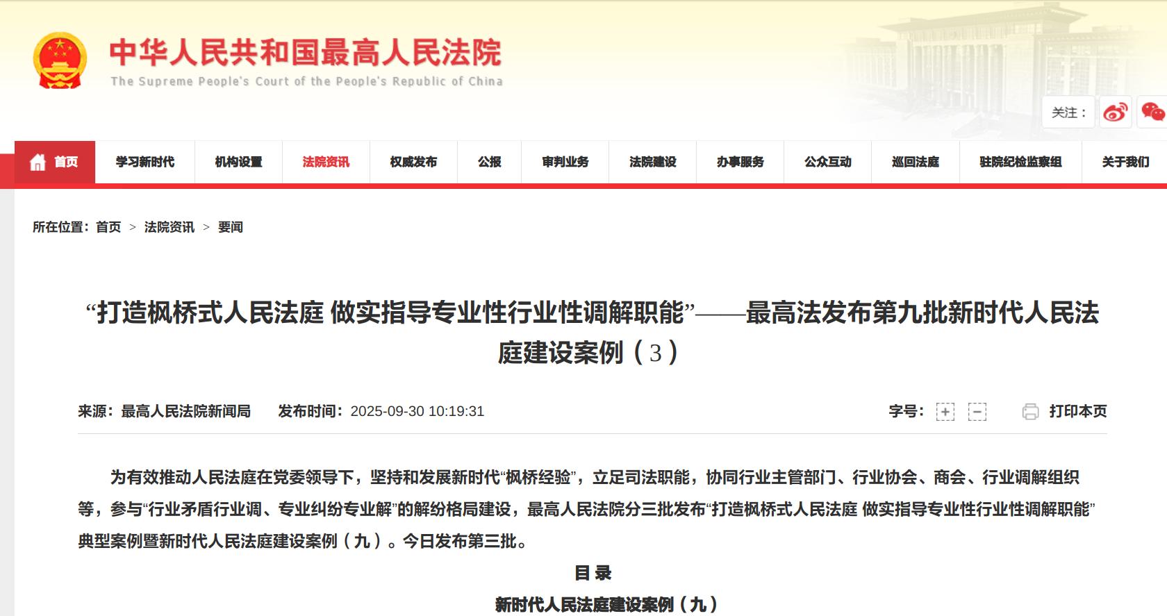 9月30日,最高人民法院发布第三批“打造枫桥式人民法庭 做实指导专业性行业性调解职能”典型案例。这批案例共15件,包括涉物业纠纷化解,涉交通事故纠纷化解,涉金融纠纷、知识产权纠纷、医疗纠纷化解等。