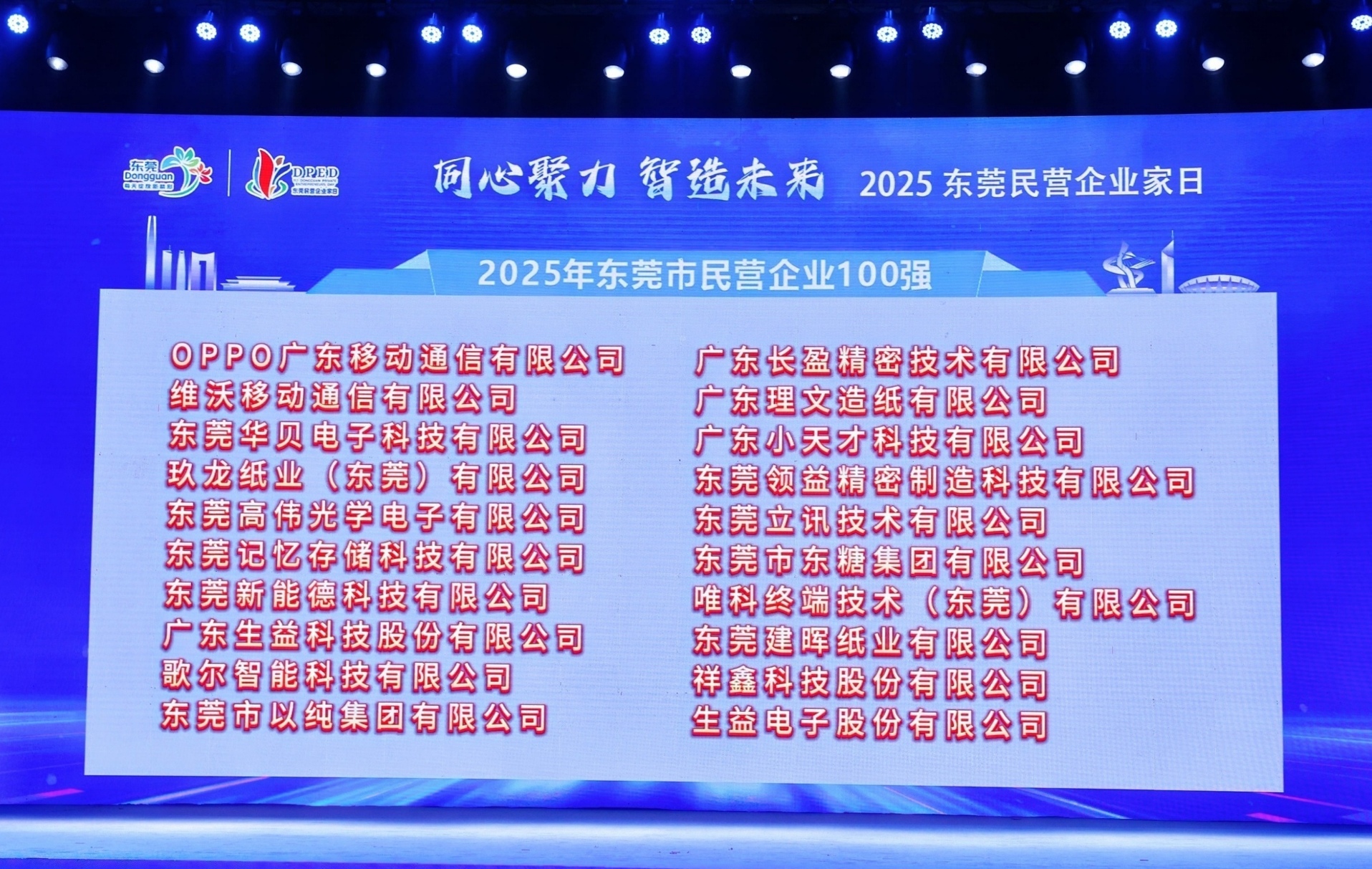 在企业类荣誉中,东莞民营企业在全国、全省榜单中表现亮眼,凸显“制造业名城”的产业根基与服务业发展潜力。其中,“2025中国民营企业500强”名单里,玖龙纸业(控股)有限公司、东莞华贝电子科技有限公司两家东莞企业强势入围,凭借扎实的营收规模与行业影响力,跻身全国民营经济第一方阵。“2025广东省制造业民营企业100强”榜单中,东莞10家企业占据重要席位,包括玖龙纸业(控股)有限公司、广东生益科技股份有限公司、马可波罗控股股份有限公司、以纯集团有限公司等,覆盖造纸、电子、建材、纺织等多个制造领域,是东莞“智造”的核心力量。