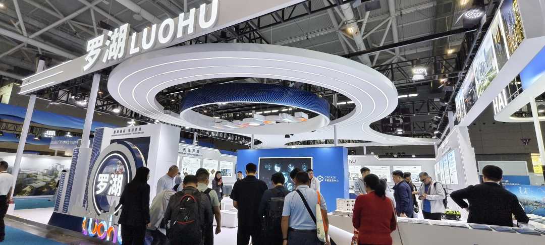 走进罗湖区展位,活力满满的机器狗吸引了众多观众驻足。展位内,蓝白主色调传递出罗湖区“服务强区”的务实创新属性,环形结构、城市天际线剪影等元素展现出新时代罗湖区开放包容的发展格局,大面积数字化显示屏与互动空间正全方位展示区域发展成果与未来规划。