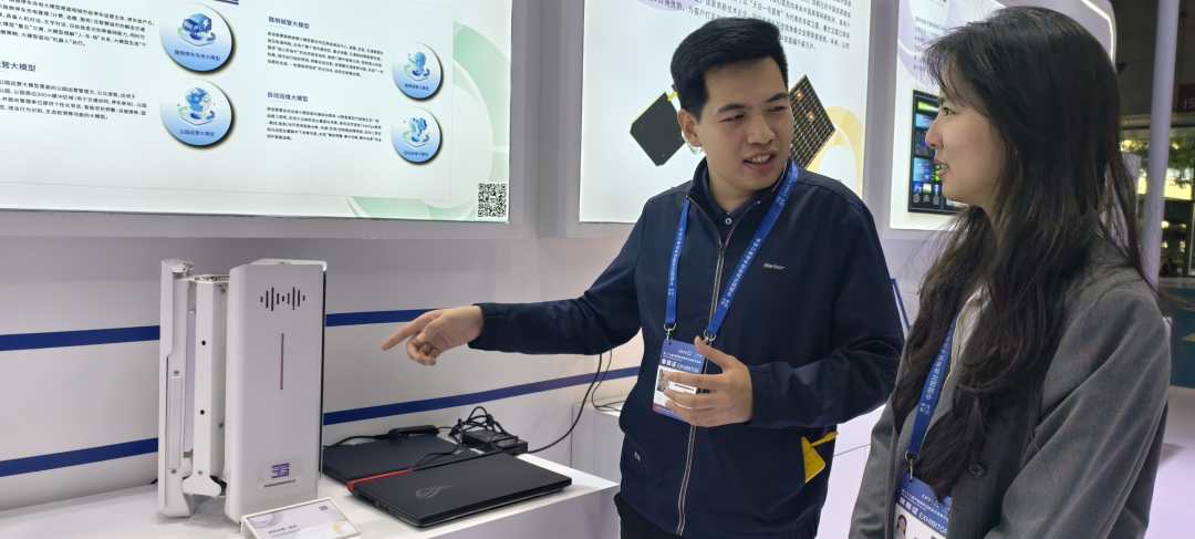 第二十七届高交会罗湖展区,奇迹智慧公司工作人员介绍AI数智基站系列产品。文阳洋摄