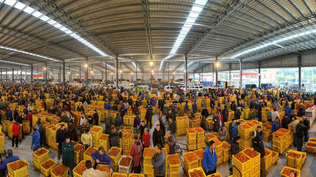 12月14日,广西壮族自治区桂林市平乐县沙子镇柿饼交易市场,众多客商正在采购,十分热闹。