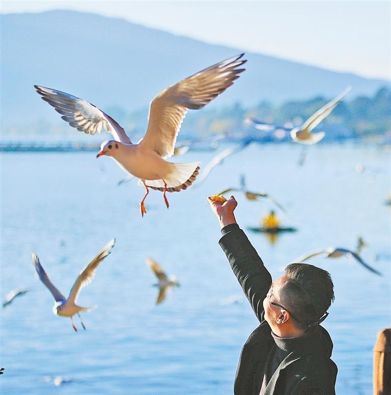 12月11日,云南省昆明市海洪湿地公园,游客与红嘴鸥互动。每年冬季,大批红嘴鸥如约而至,成为当地一道特色风景。刘昌松摄(中经视觉)