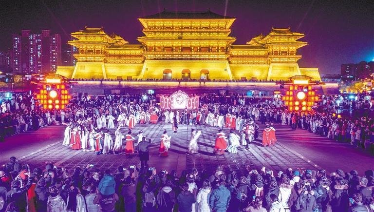 12月13日,河南省洛阳市隋唐洛阳城景区应天门北广场,游客在观看《神都狂欢》演出。景区通过增加演出场次、优化灯光效果等措施,为游客营造有感染力的沉浸式体验,激发冬日“夜经济”活力。张怡熙摄(中经视觉)