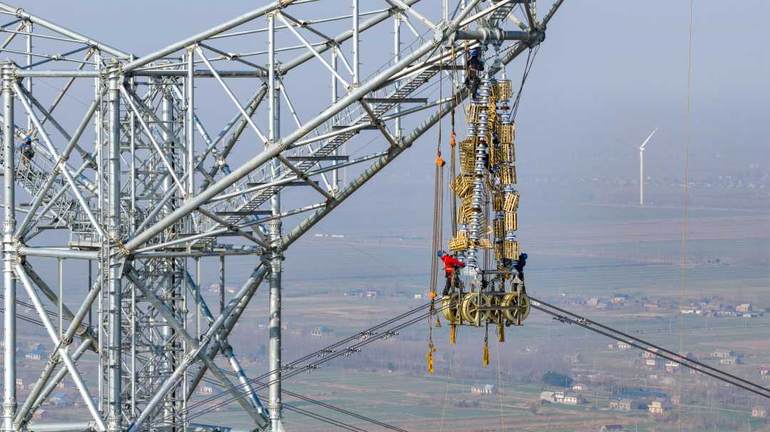 12月16日,位于江苏省盐城市的国电投滨海电厂—鹤栖500千伏线路工程现场,电力工人正进行架线作业。据悉,该工程位于淮河入海水道南北两侧,预计年底建成投运。投运后将为淮河北部的沿海风电和清洁煤电提供新的送出通道。