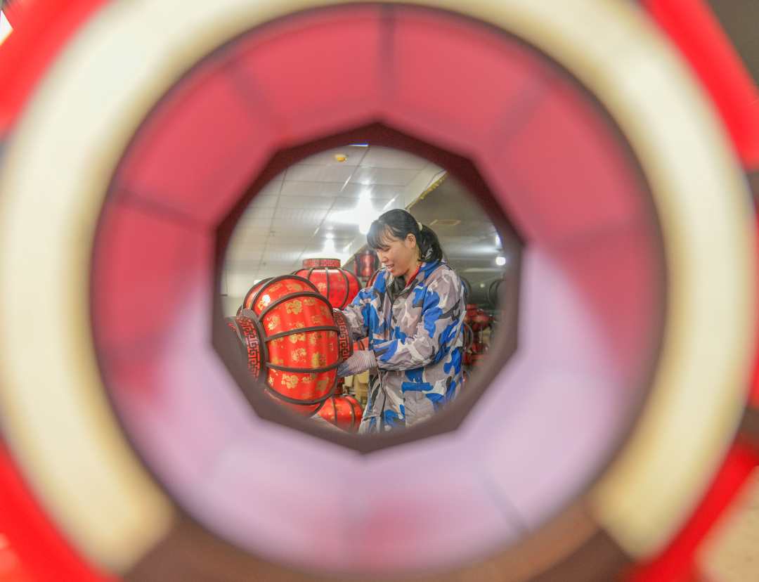 12月23日,位于湖南省永州市道县高新技术产业开发区的一家灯笼加工厂,工人在制作灯笼。