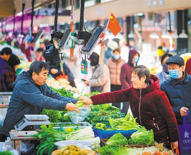 12月16日,安徽省马鞍山市花山区新岗菜场,各类瓜果蔬菜供应充足、品种丰富,前来选购的市民络绎不绝。 张明伟摄(中经视觉)