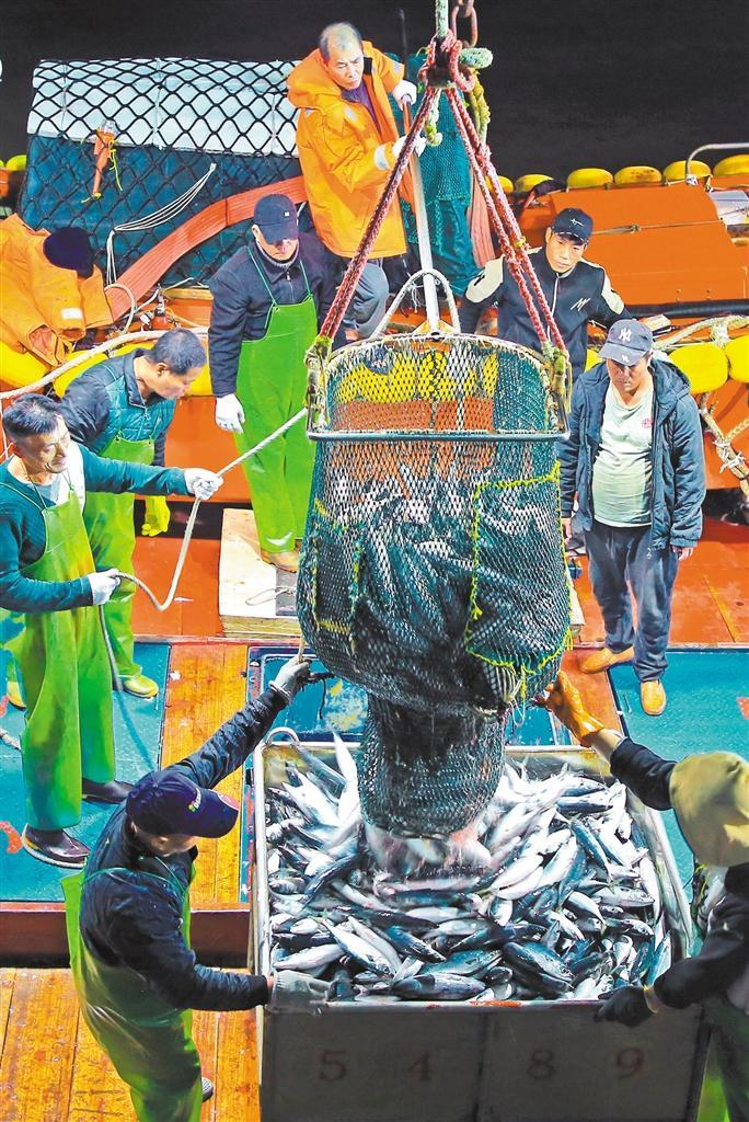12月11日,捕捞归来的渔船停靠在浙江省玉环市大麦屿渔港码头,渔民将大量海鲜卸载分拣、保鲜运送,丰富市民“菜篮子”。段俊利摄(中经视觉)