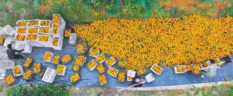 12月19日,重庆市酉阳土家族苗族自治县偏柏乡柏溪村村民在采收脐橙。当地采用线上线下融合模式,为水果拓宽销路。石嘉黎摄(中经视觉)