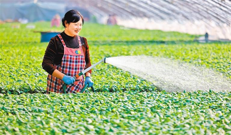 12月4日,四川省遂宁市安居区聚贤镇蔬菜大棚,工作人员在采摘油麦菜。当地采用潮汐式苗盘无土栽培,让蔬菜产量更稳定。 张勤宝摄 (中经视觉)
