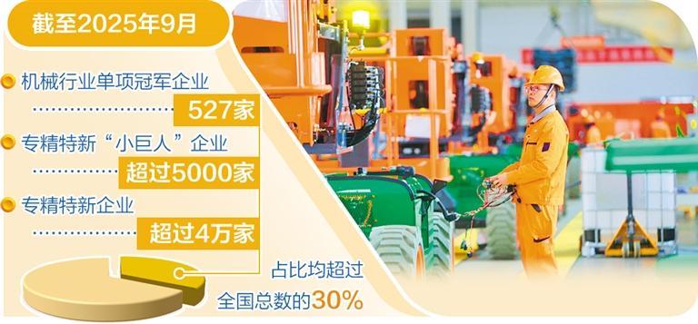 如今,机械工业已逐步建立起以内需为支撑、以创新为核心的内生式发展体系。数据显示,到2024年底,机械工业规模以上企业数量从“十三五”末的9.2万家增至13.2万家,占全国工业比重从24.1%提升至25.8%。截至2025年9月,机械行业单项冠军企业527家,专精特新“小巨人”企业超过5000家,专精特新企业超过4万家,占比均超过全国总数的30%。