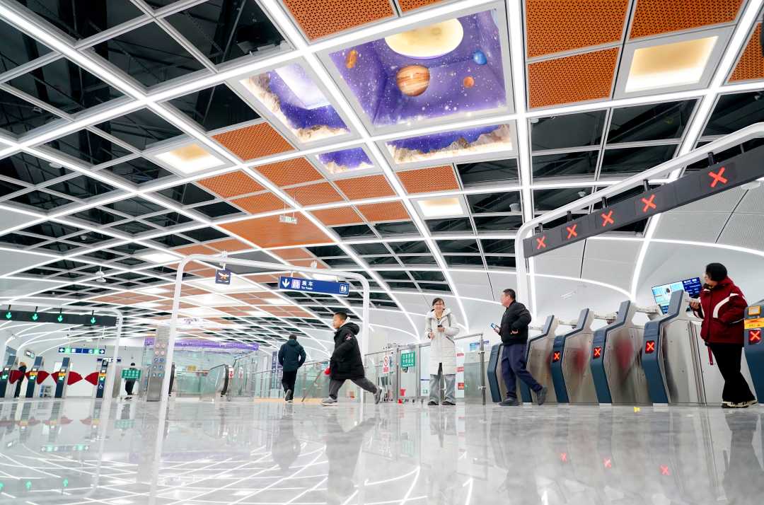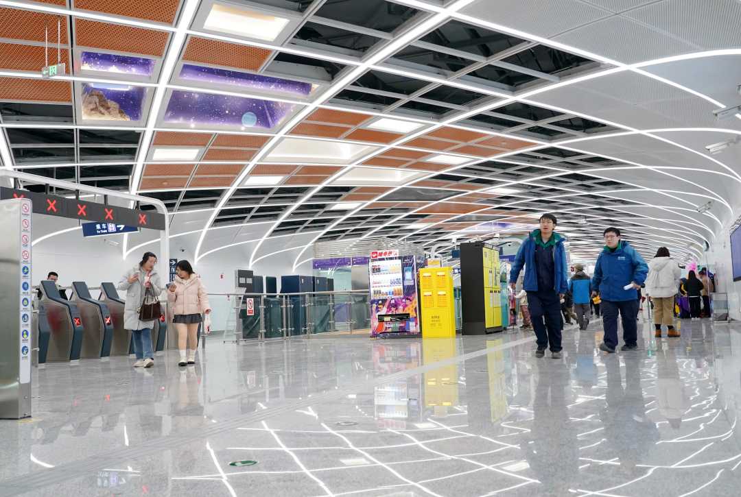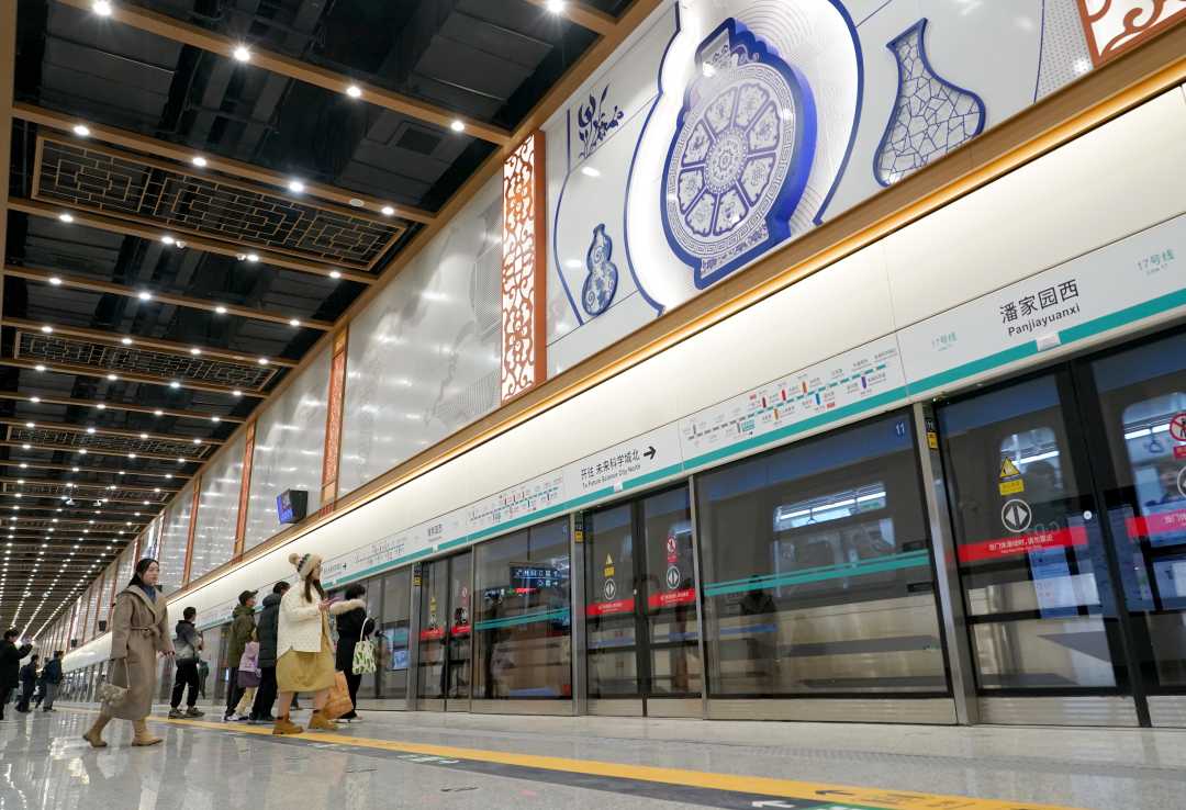 12月27日,乘客在北京地铁17号线潘家园西站站台候车。该站在设计中融入青花瓷、古玩等文化元素,彰显文化、科技与艺术的碰撞。本报记者赵晶摄