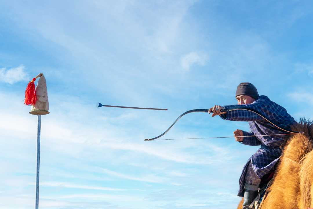 12月28日,2025阿拉善骆驼超级联赛现场,骑手在乘驼射箭比赛中疾驰张弓,展现传统骑射技艺。