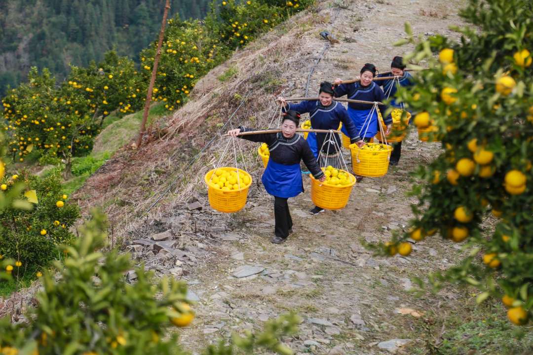 12月27日,贵州省榕江县忠诚镇干烈村兴农鲜果家庭农场,村民在搬运黄金柚。