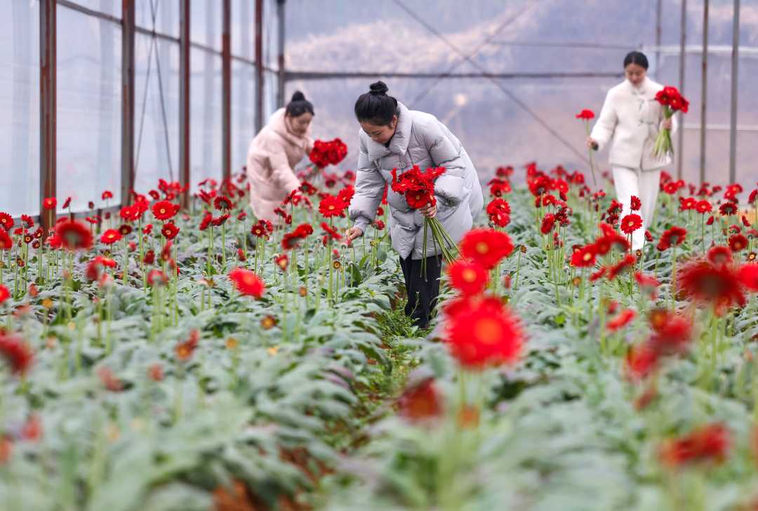 12月29日,贵州省铜仁市玉屏侗族自治县朱家场镇茅坡村鲜花种植基地,顾客在采摘非洲菊。