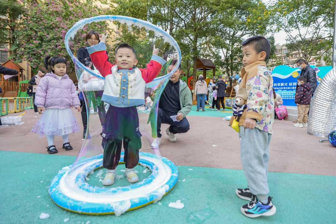 12月30日,福建省福州市台江区滨江幼儿园,小朋友在体验梦幻泡泡秀项目。