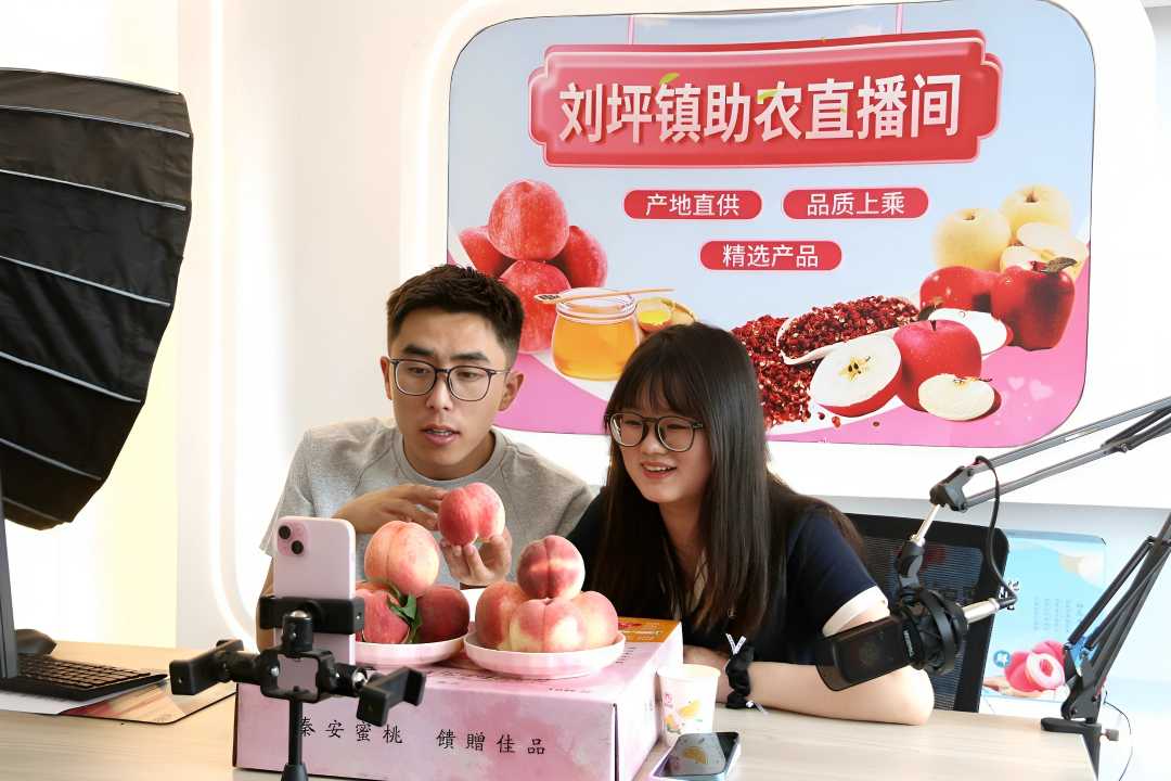 在秦安县刘坪镇助农直播间,网络主播在销售秦安蜜桃。