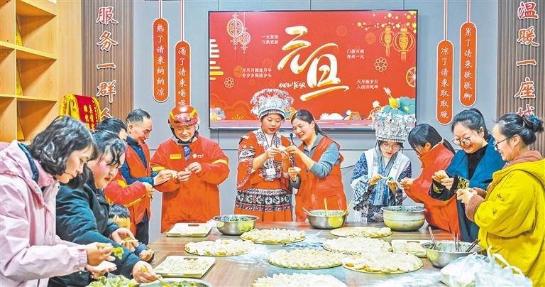 2025年12月29日,江苏省宿迁经济技术开发区黄河街道九鼎社区开展“我们的节日·元旦”主题活动,邀请新就业群体与居民一起包饺子,迎新年。徐江海摄(中经视觉)