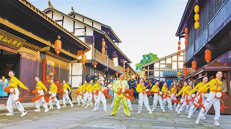 2025年12月28日,四川省广安市协兴老街开展腰鼓、川剧变脸等非遗民俗表演,喜迎元旦佳节。张 波摄(中经视觉)
