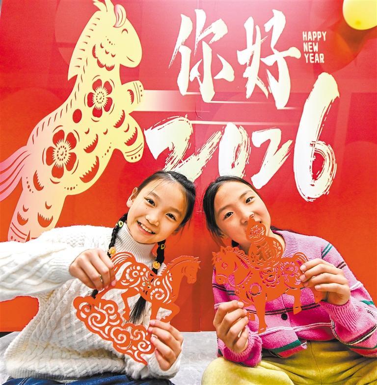 2025年12月28日,江西省南昌市青云谱区徐家坊街道塔子桥社区,孩子们在展示迎新年剪纸。鲍赣生摄(中经视觉)