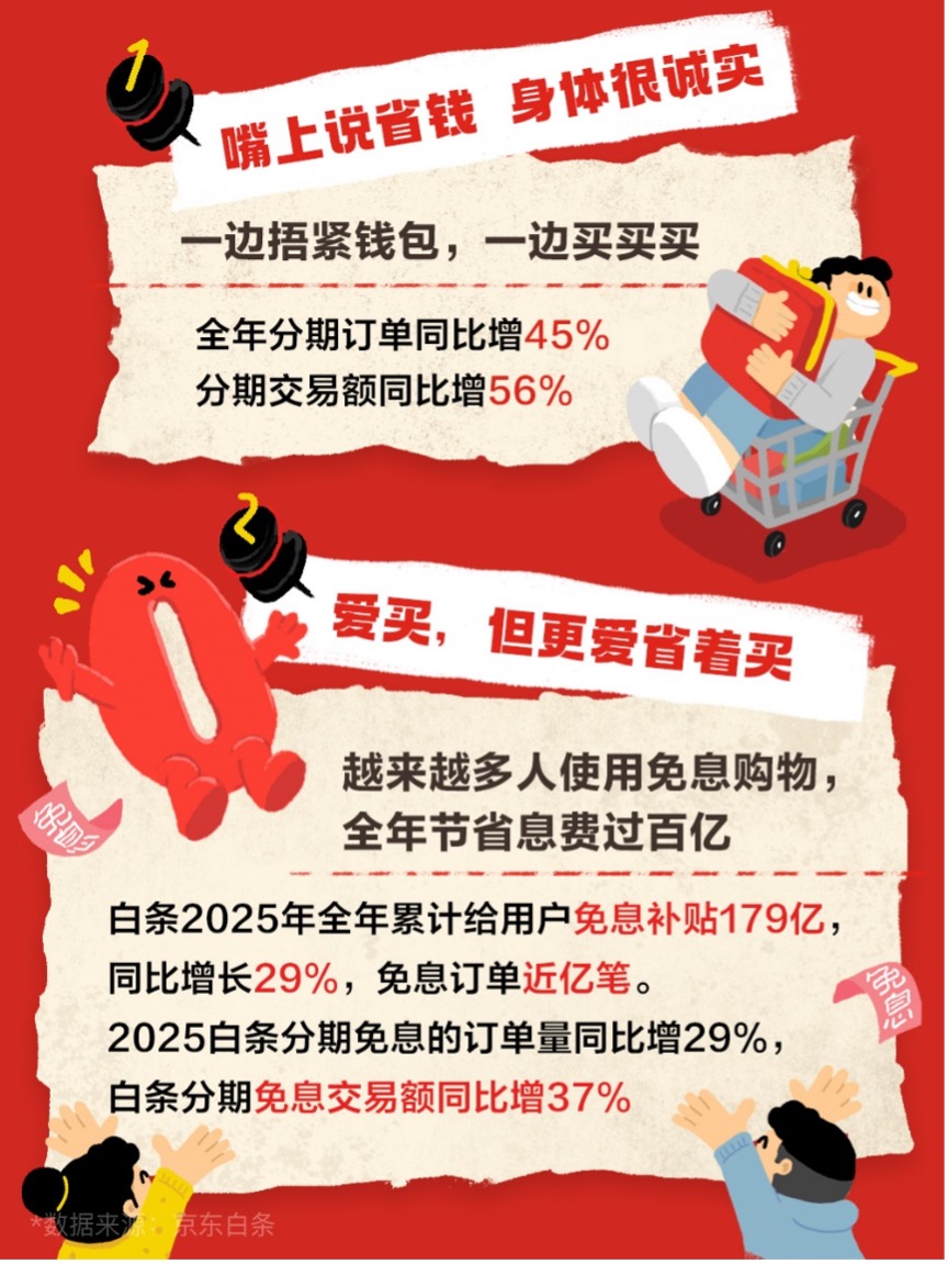 《2025京东白条消费报告》数据显示,2025年京东白条累计为用户提供免息补贴超179亿元,同比增长29%,免息订单近亿笔;白条分期订单量同比增长45%,分期交易额同比增幅达56%,免息政策有效降低消费者的购物门槛。