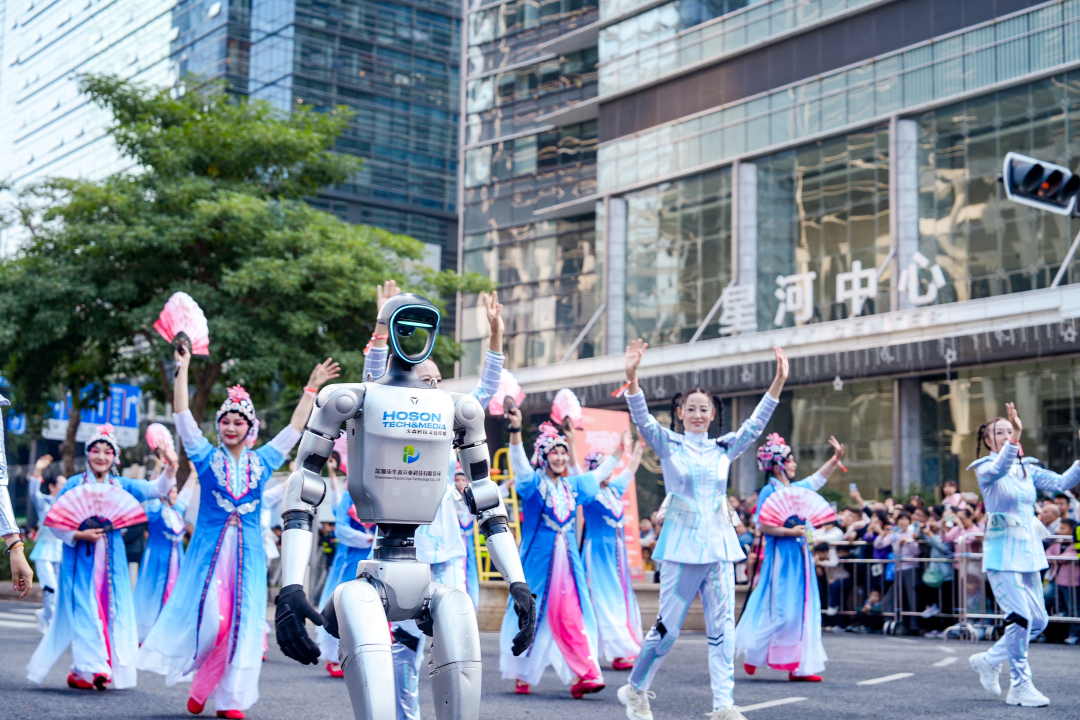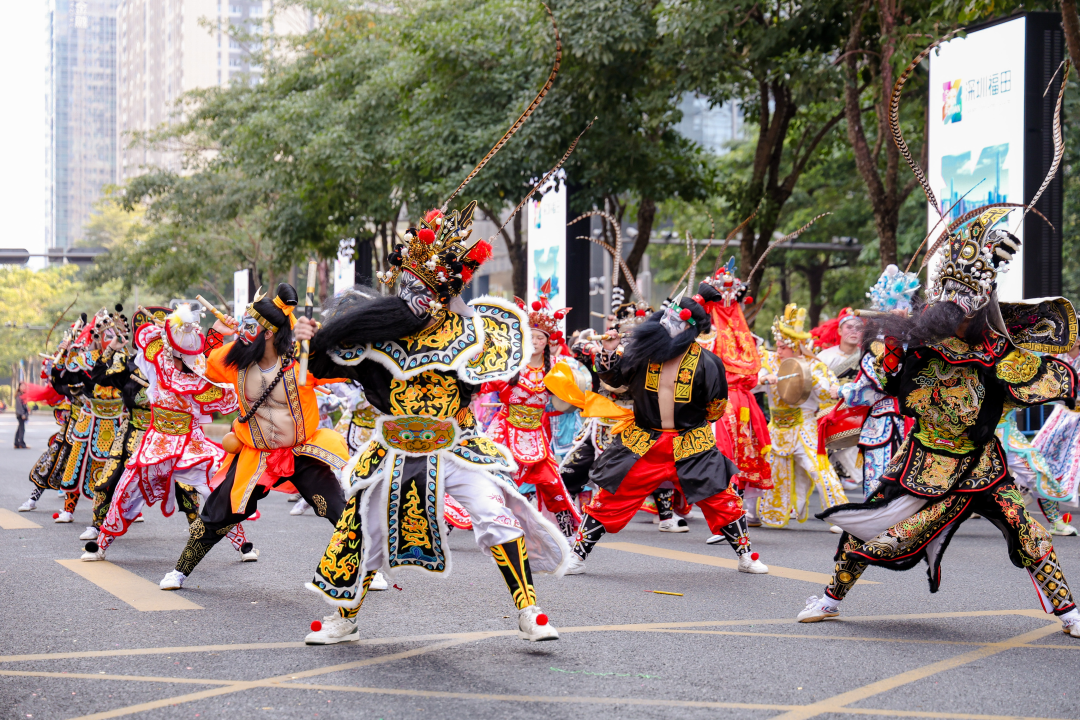 来自深圳本土的巡游方阵凸显了文化与科技融合、传统与现代叠加的新风尚,其中福田金丝猴影偶方阵打造4组3米高的巨型背架木偶,与观众频频互动,让现场变成了欢乐的海洋;BitCity次元小镇“次元福瑞”方阵带来了福瑞兽装与国漫IP角色展示,受到少年儿童的欢迎;深圳歌剧舞剧院少儿舞蹈团、曾登上全运会闭幕式舞台的深圳少年警营交警乐团纷纷上阵,展示了新时代少年风采;福田区长青老龄大学代表则创新融合京剧《粉墨春秋》与智能轮椅、机器人共舞,展示了“银发族”的活力与优雅。