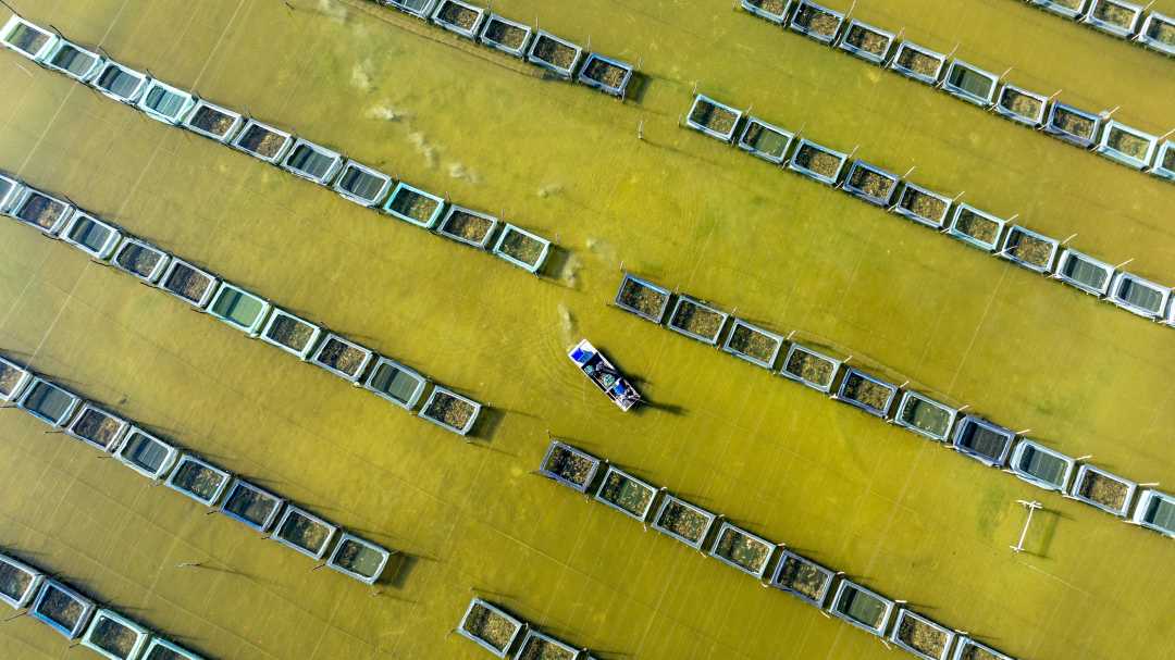 1月11日,江苏省宿迁市泗洪县临淮镇大闸蟹养殖基地,蟹农在管护大闸蟹。