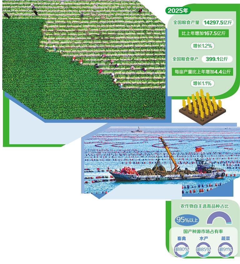 粮食产量再创历史新高,连续2年稳定在1.4万亿斤以上;“菜篮子”产品供给充足、种类多样,全国农产品质量安全监测合格率达98%;农业科技进步贡献率超64%,农作物自主选育品种面积占比超95%……岁序更替,农事不停,农业农村工作交出了2025年答卷。