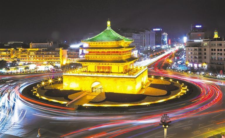 1月10日,夜幕中的陕西省西安市钟楼灯火璀璨,车水马龙。 薛 刚摄(中经视觉)
