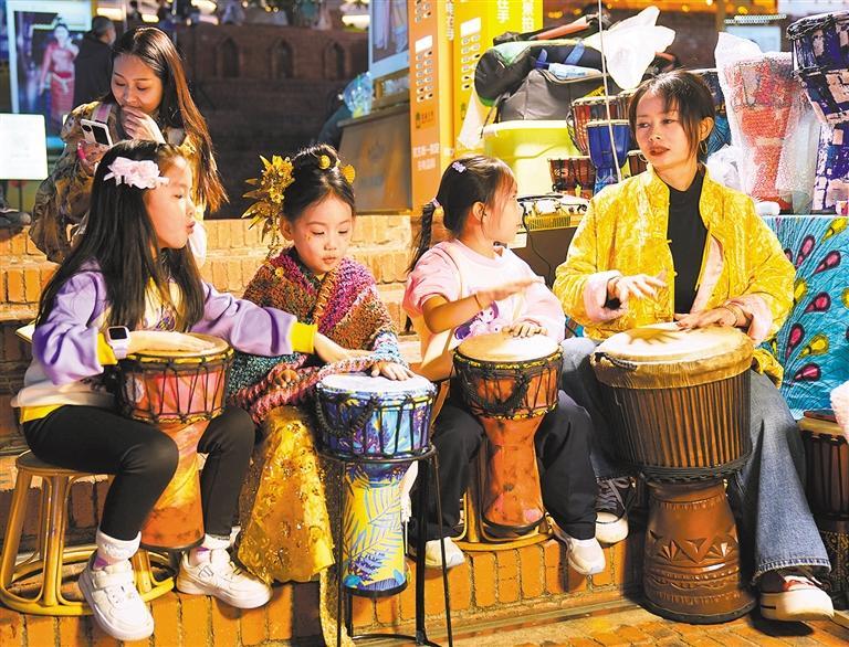 1月9日,云南省景洪市告庄西双景星光夜市,小朋友在学习打手鼓。该夜市集休闲度假、商贸居住等功能于一体,打造沉浸式夜游氛围。梁志强摄(中经视觉)
