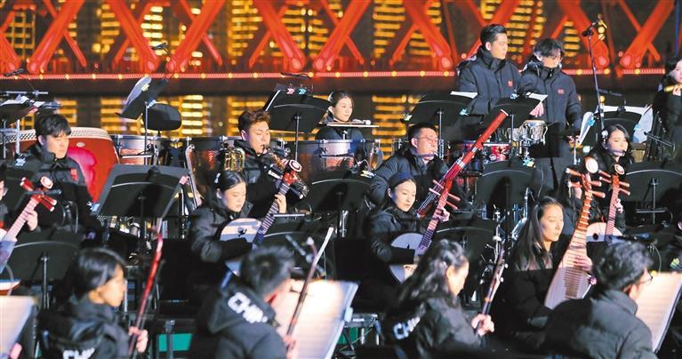 2025年12月21日,重庆大剧院户外广场,重庆民族乐团在演奏乐曲,丰富市民游客夜生活。 孙凯芳摄(中经视觉)