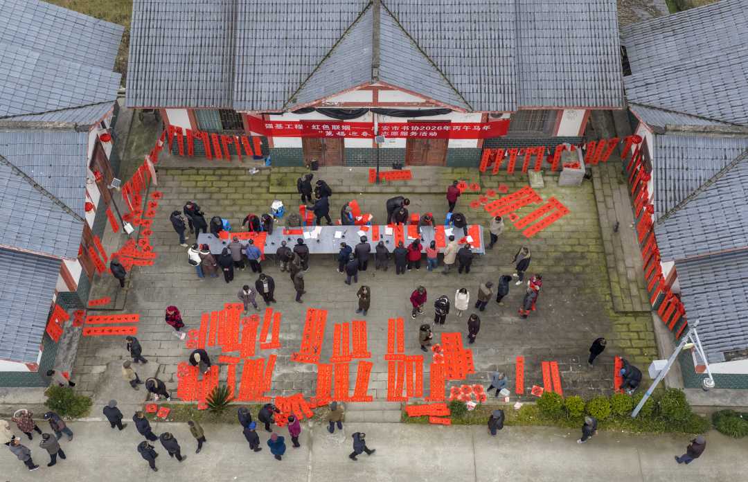1月14日,四川省广安市广安区石笋镇将军村,文艺工作者为村民现场书写春联和“福”字。