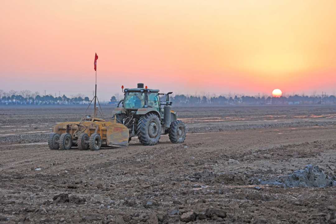 1月14日,安徽省安庆市宿松县农垦华阳河农场,农机手驾驶搭载北斗导航的激光平地机开展土地平整作业,备战春耕。