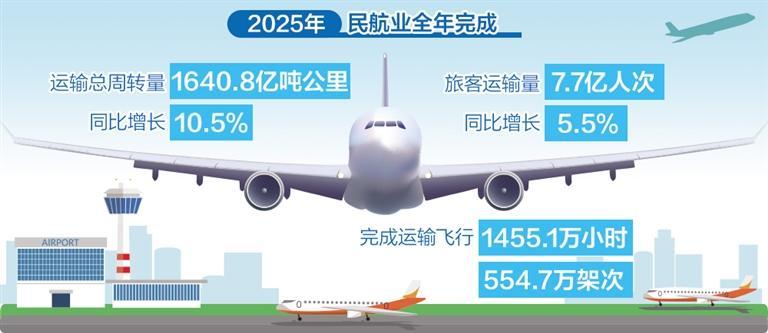 2025年,民航业全年完成运输总周转量1640.8亿吨公里、旅客运输量7.7亿人次,同比分别增长10.5%、5.5%;完成运输飞行1455.1万小时、554.7万架次。