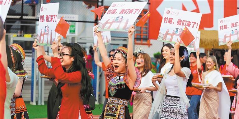 2024年4月13日,黔东南州榕江县村超赛场,贵州大学拉拉队入场。从2023年的20支参赛队伍到2026年的137支,“村超”参赛球队不断扩容,影响力日益增强。黄万鑫摄(中经视觉)