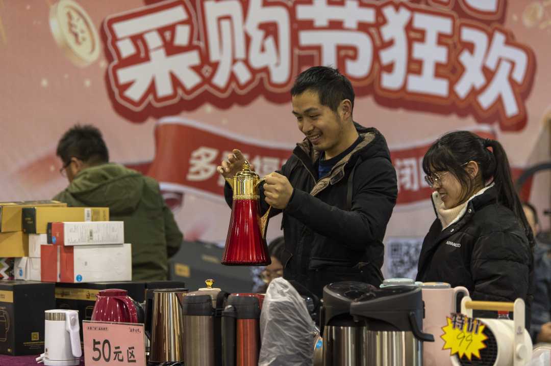 1月16日,浙江省金华市永康国际会展中心展馆里,市民在2026年永康“金”品采购节上采购五金生活用品。