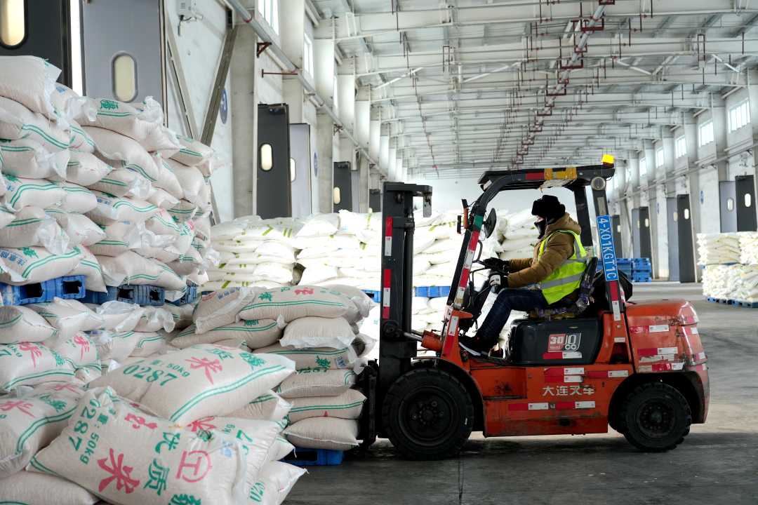 图为中欧班列(乌鲁木齐)集结中心内,铁路作业人员正在进行粮食装车作业。梁云皓摄