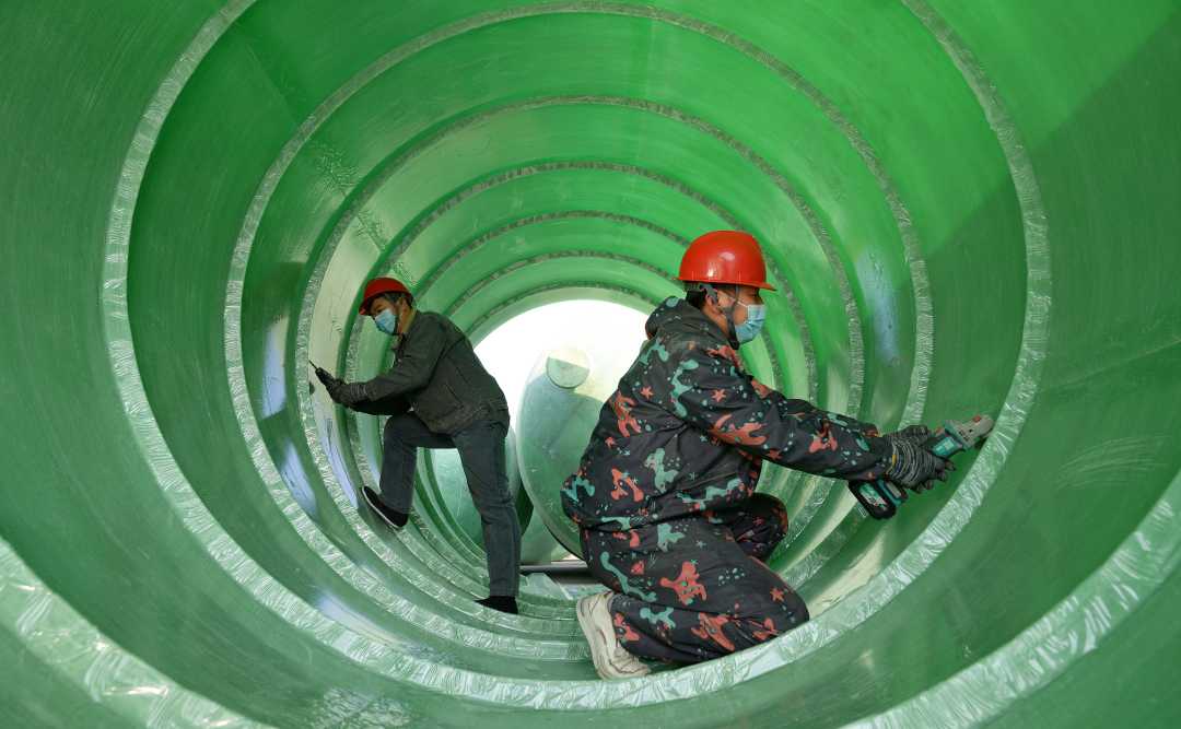 1月16日,江苏省海安市南莫镇江苏五水环境工程有限公司,工人在赶制污水处理设备。