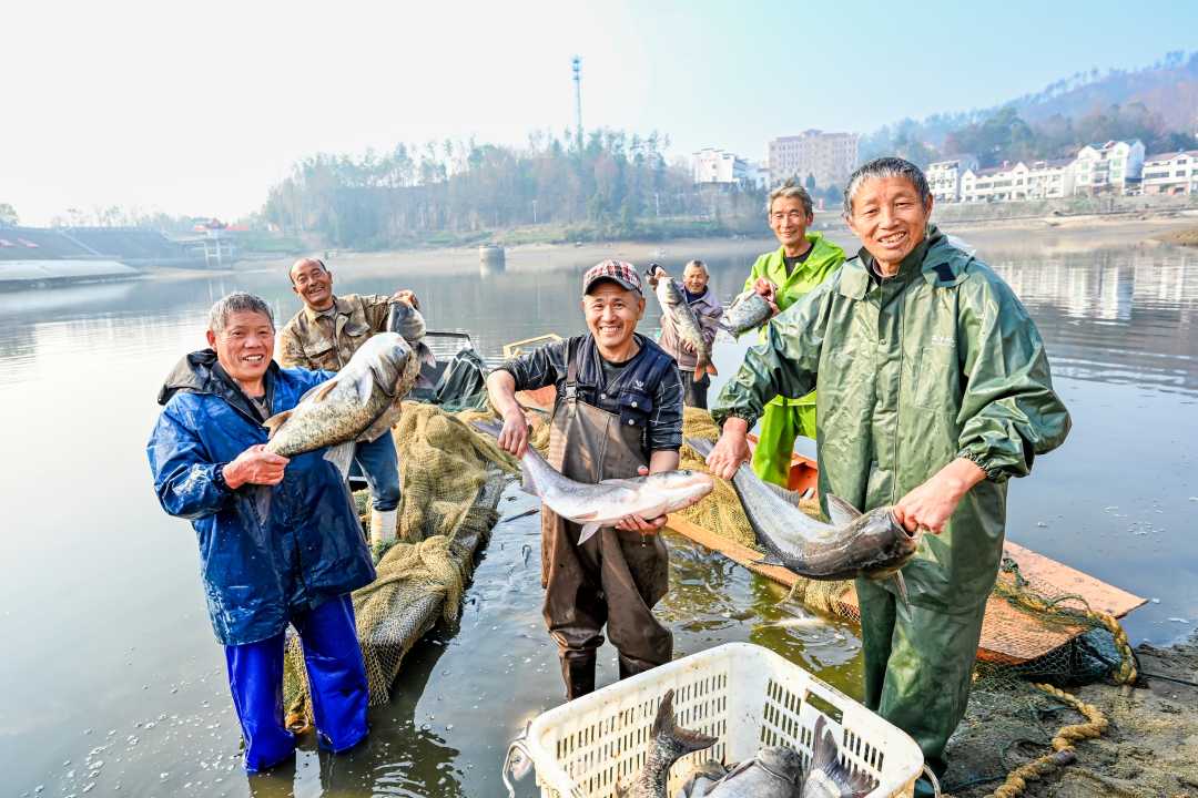 1月17日,湖北省黄冈市英山县红山镇乌云山村,村民在捕收年鱼。