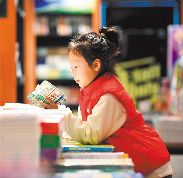 2025年12月14日,贵州省仁怀市西西弗书店,小朋友在认真阅读《三字经》。