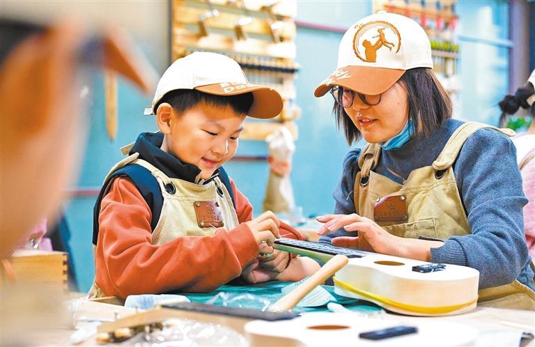 2025年12月13日,读者在河南省洛阳市图书馆体验手工制作。
