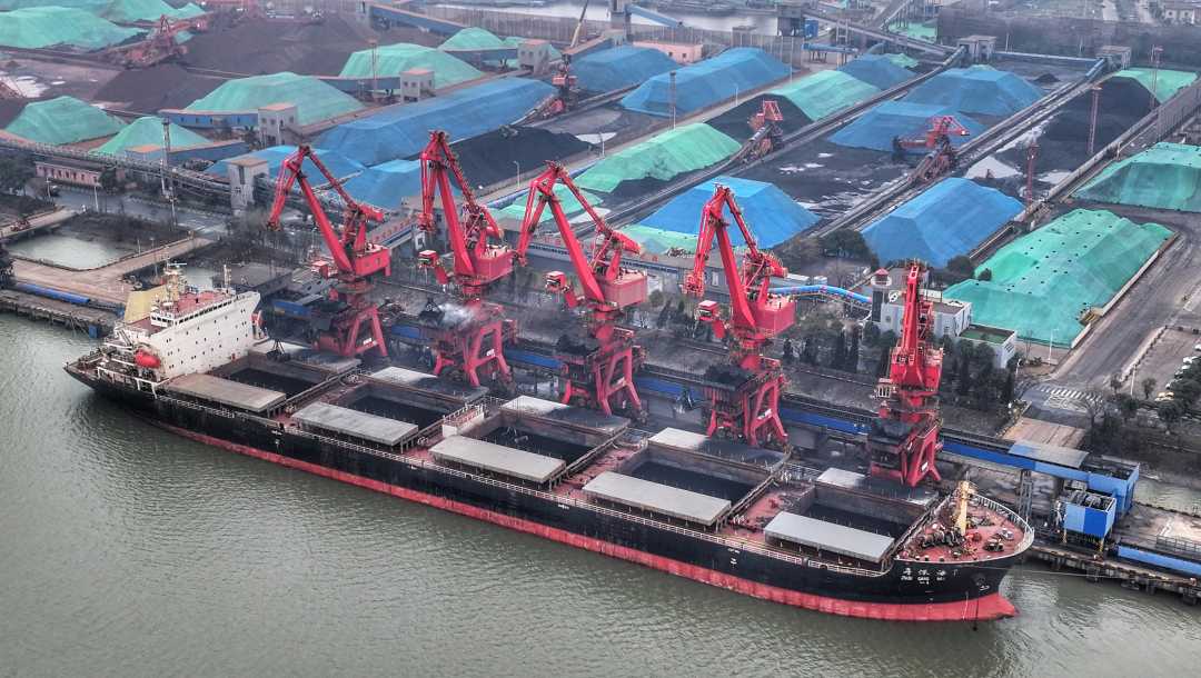 1月17日,江苏省张家港港,货轮在煤炭码头有序转运电煤。