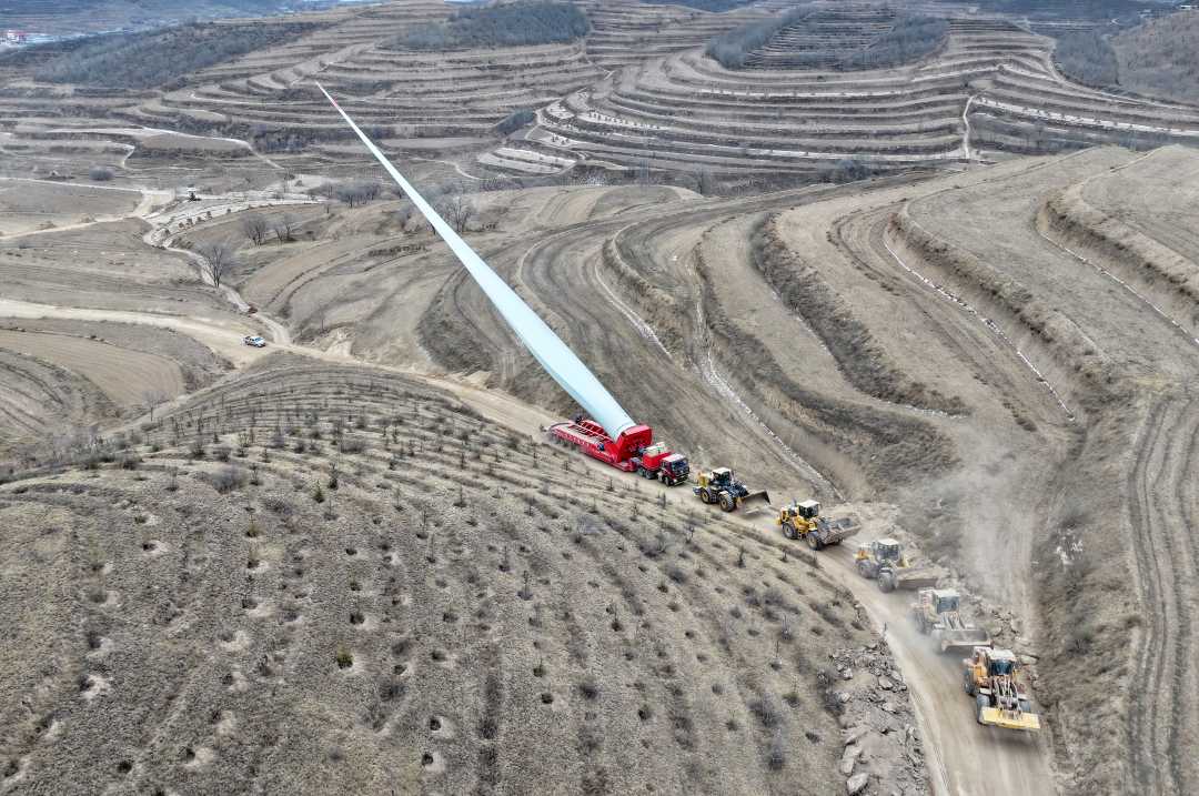 1月18日,宁夏回族自治区固原市西吉县“宁电入湘”工程配套固原100万千瓦风电基地项目现场,工人在转运风机组件。
