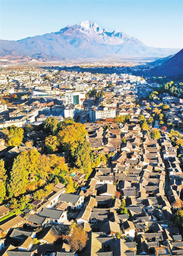 2025年12月5日,玉龙雪山下的丽江古城。丽江市推动丽江古城遗产保护和景区发展,加强非物质文化遗产保护利用,打造了30余个特色文化院落。