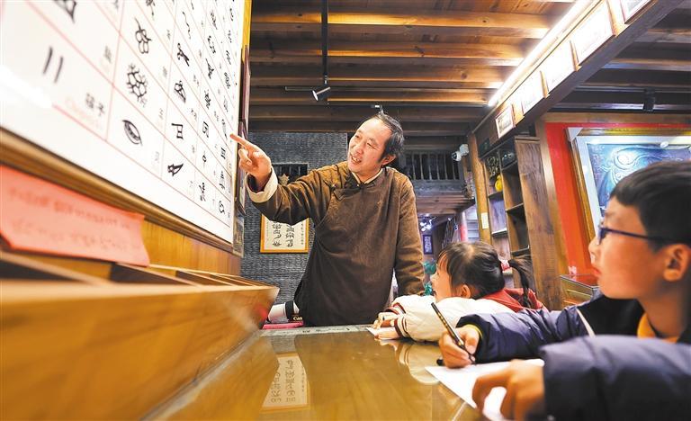 2025年12月5日,丽江古城纳西东巴象形文字绘画体验馆负责人和闰元(左)向孩子们介绍纳西象形文字。