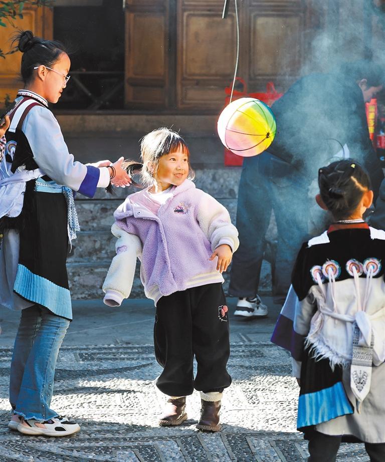 2025年12月6日,小朋友在丽江市玉龙纳西族自治县白沙镇玉湖村一客栈内开心玩耍。