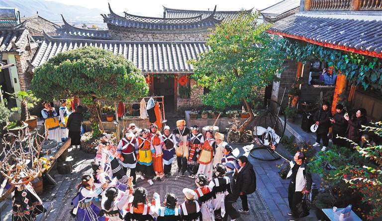 丽江市深挖世界文化遗产内涵,活化利用非遗,开放特色文化院落;推出《印象丽江》《丽江千古情》等民族歌舞演艺,展现民族交往交流交融场景……通过文化赋能,“舍不得的丽江”品牌影响力持续扩大。据统计,丽江市游客接待量从2020年的2625万人次增长至2024年的8064万人次,年均复合增长率32.4%,2025年预计突破8300万人次;旅游总花费从2020年的510亿元增长至2024年的1385亿元,年均复合增长率28.5%。(经济日报记者 高兴贵 管培利摄影报道)