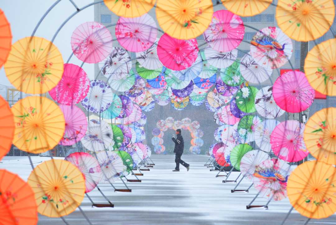 1月19日,江苏省徐州市睢宁县城区,雪花纷纷扬扬,市民从由五彩缤纷油纸伞搭成的长廊通过。